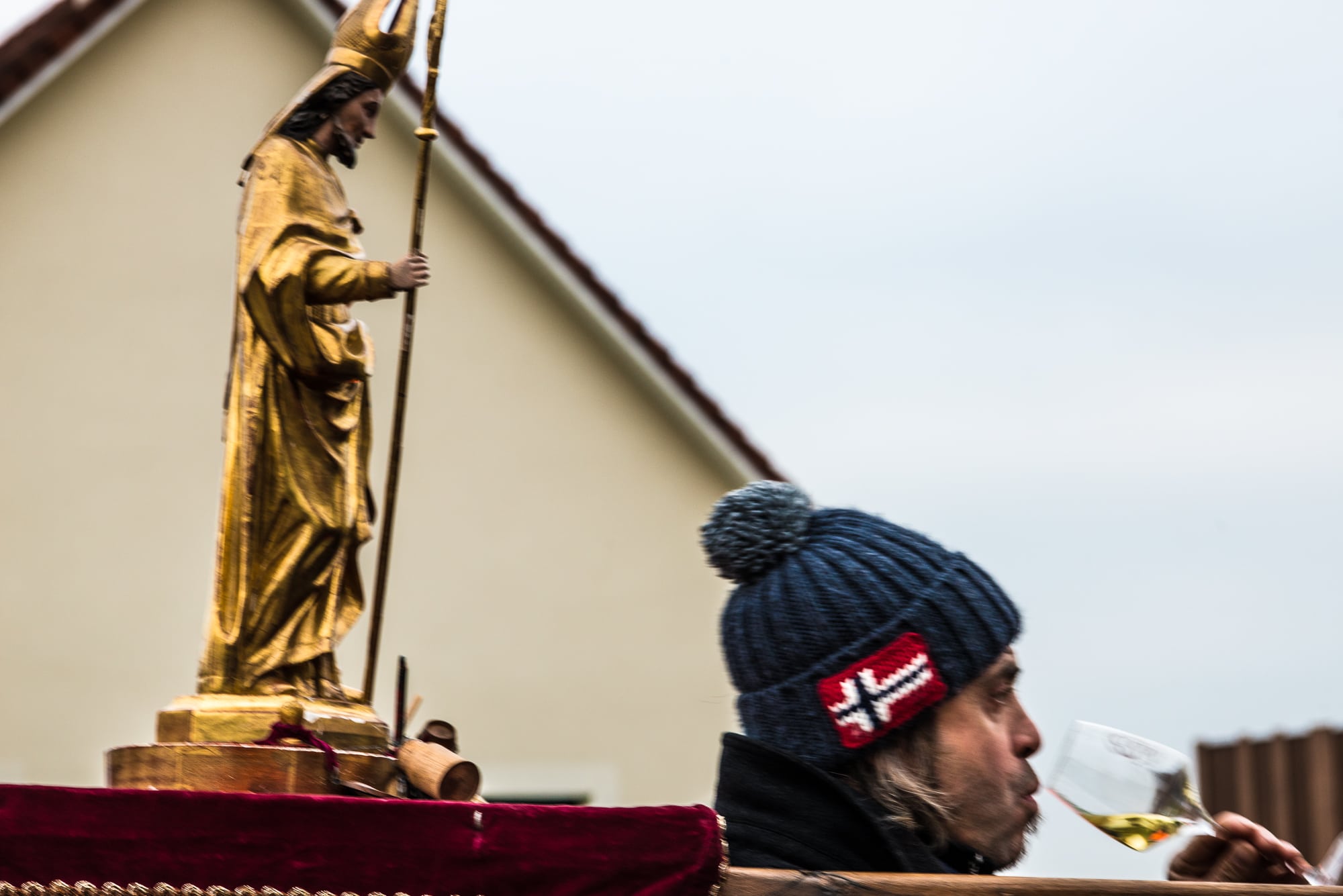 Rien de tout cela entre Gilly et Vougeot. Le cortège singulier des villages et de leurs saints, en sortant de l’église, a été béni par les flocons. Les spectateurs volontaires de la cérémonie applaudissaient, pressés ensuite de poursuivre leur périple de plusieurs kilomètres pour déguster les sept cuvées de la Saint-Vincent. En ordre bien maîtrisé, la dégustation commençait avec le C de Cîteaux, avec un blanc d’entrée, pour se terminer avec le “X” qui symbolise le versement du “salaire” espéré, un grand cru portant au choix le nom de Clos de Vougeot ou d’Echezeaux. In excelsis Deo.