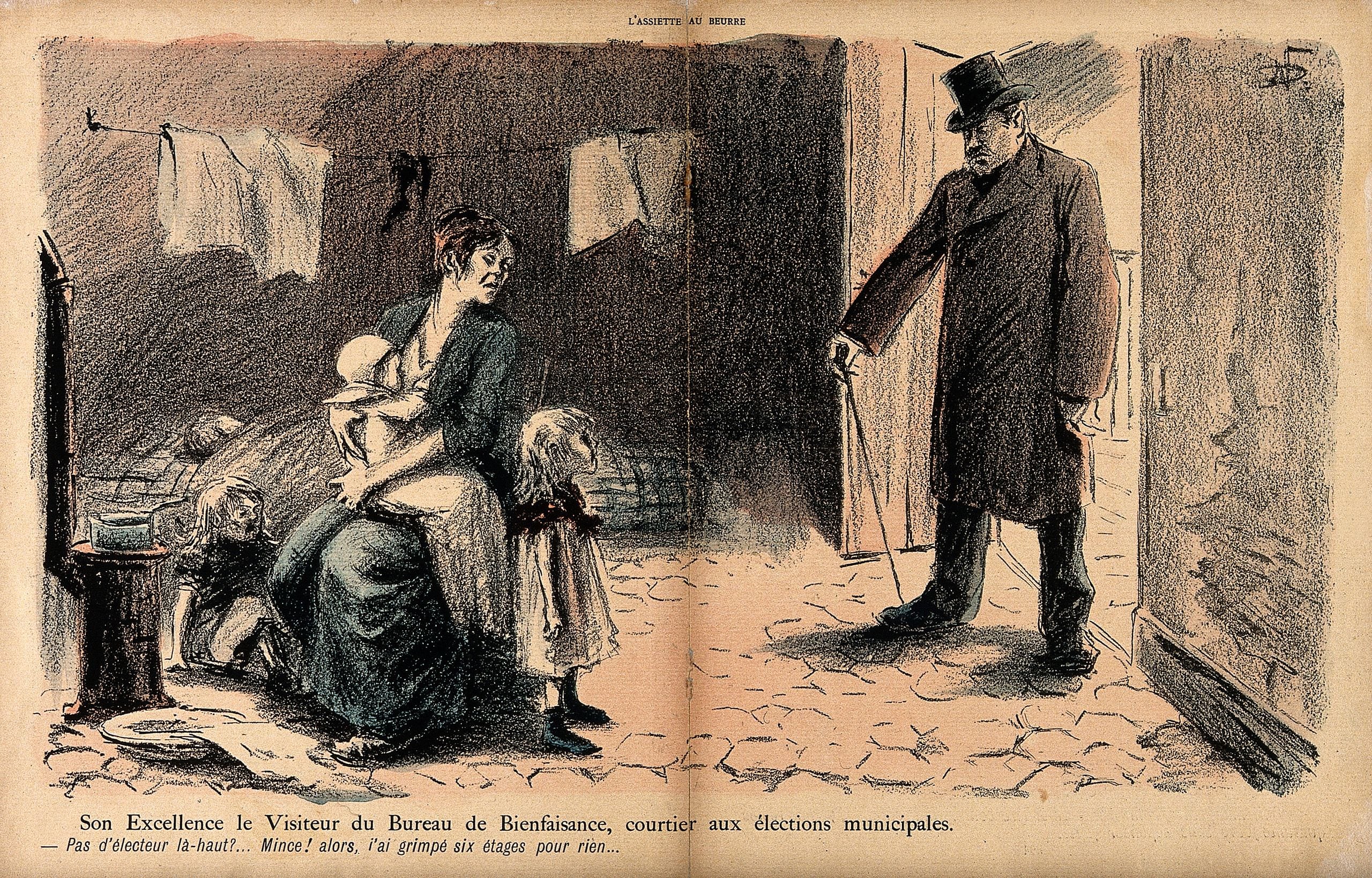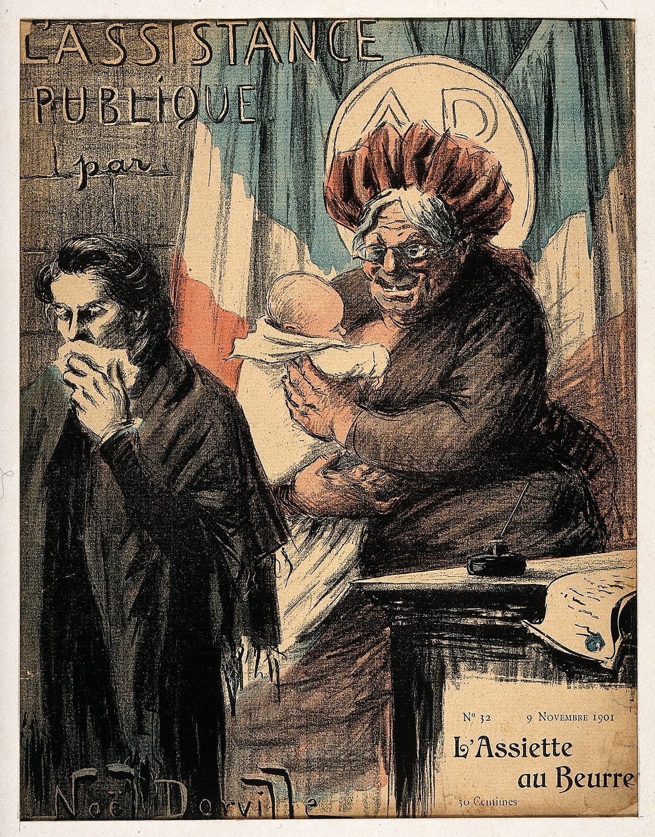Noël Dorville est un Bourguignon au sens plein du terme. Né en 1874 à Mercurey en Saône-et-Loire, mort à Cosne-Cours-sur-Loire en 1938 à cause d’une santé fragile, il a épousé une beaunoise qui a légué le fonds de l’atelier de son artiste de mari à la ville de Beaune en 1948. Certes, il n’avait rien de la hargne d’un Charb ou des facéties culottées d’un Cabu, mais il était de son époque. Son art, moins féroce que chez Daumier et peut-être moins drôle que chez André Gill, se distingue par un sens de l’observation acéré, qui lui a valu de faire régulièrement la “une” des grands journaux satiriques de son vivant.