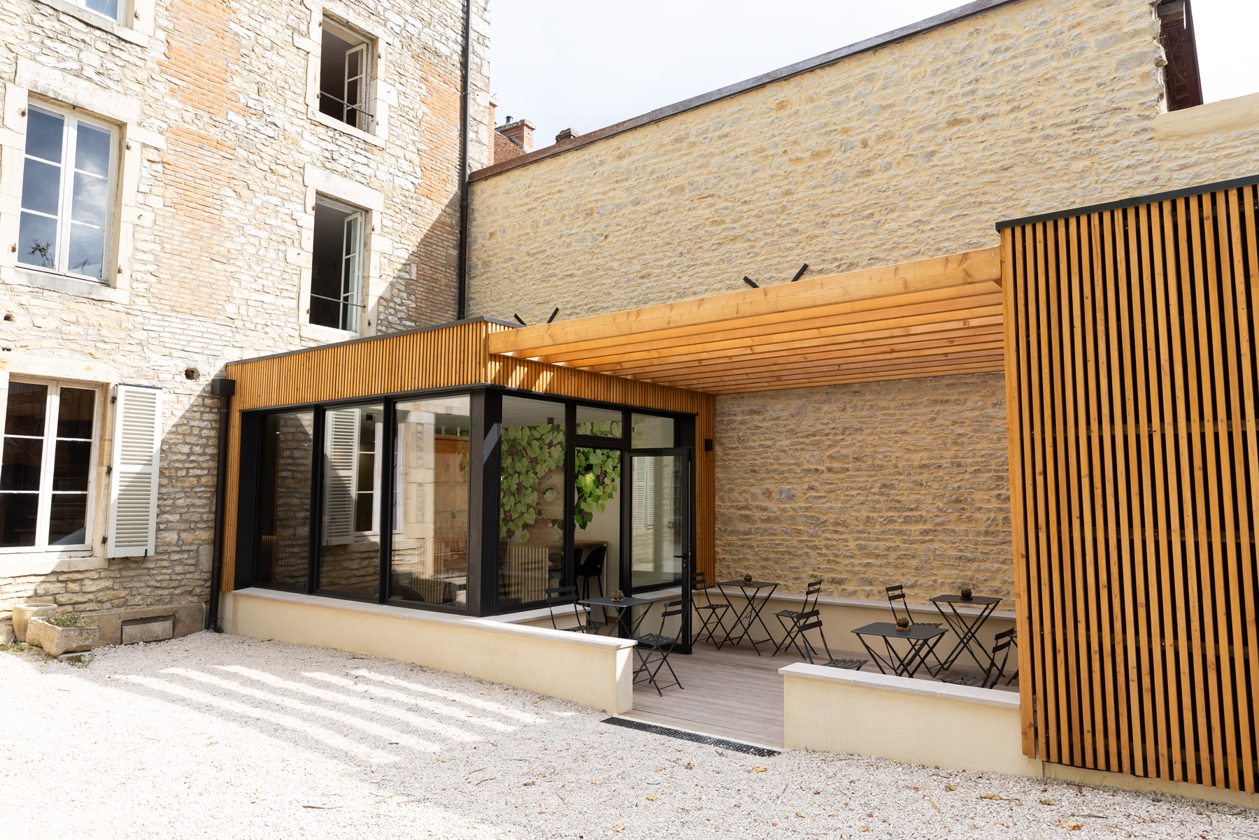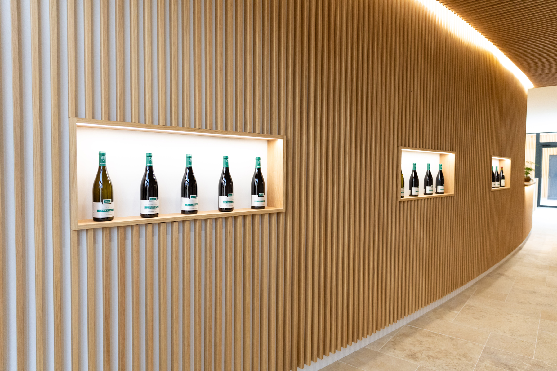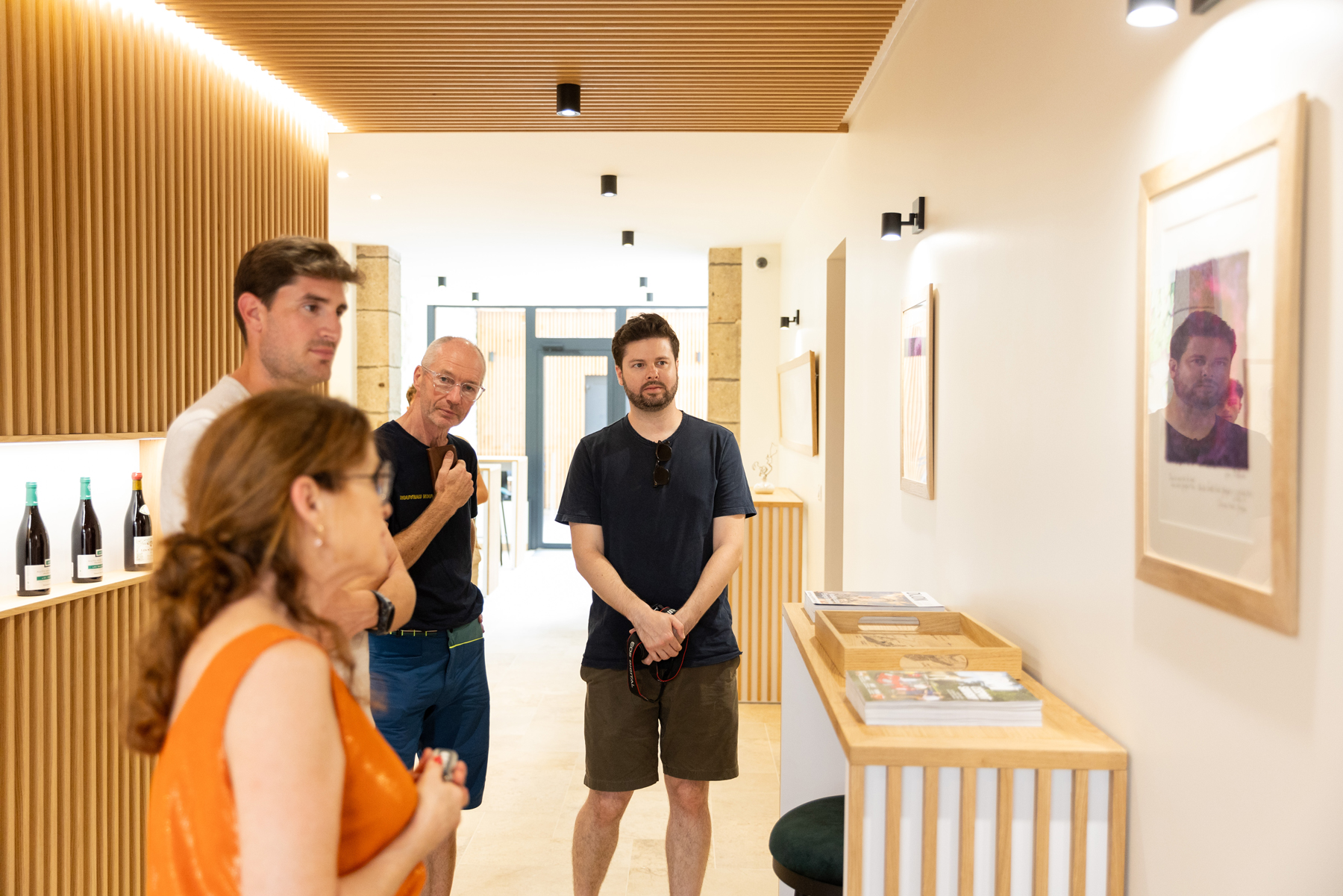 Un espace dégustation occupe désormais une partie de l’ancienne demeure du charismatique Henri Gouges (1889-1967), précurseur des AOC viticoles. Classe et sans artifice, la réhabilitation est à la hauteur des vins. Elle joue la carte du local, des peintures de leur voisine Joyce Delimata aux beaux sets de dégustation signés Le Menuisier de la Cave (Premeaux-Prissey). Vinie Graffiti, la première à avoir posé un jet de spray sur les murs de La Karrière en 2016, est venue habiller un pan de mur. Grâce à la street artiste, les dégustateurs sont couvés par les beaux yeux d’une créature afro-viticole.