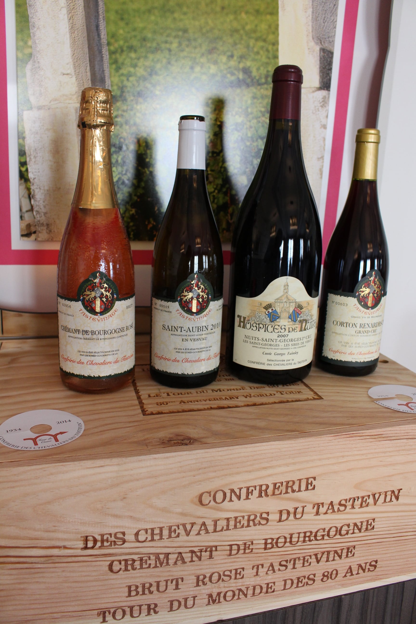 Après un tour du monde effectué en 80 jours, les 4 vins de Bourgogne expédiés par les Chevaliers du Tastevin  _ un saint-aubin en Vesvau 2010 tasteviné, un nuits-saint-georges 1er cru Les Saint-Georges 2007 des Hospices de nuits, un corton grand cru Renardes 2007 tasteviné et un crémant de bourgogne bru rosé tasteviné_ sont arrivés à bon port le 17 septembre dernier. 4 vins, 80 jours: la phonétique rebondit sur l’anniversaire de la plus incroyable des confréries, née il y a tout juste 80 ans, en pleine crise économique, déjà.