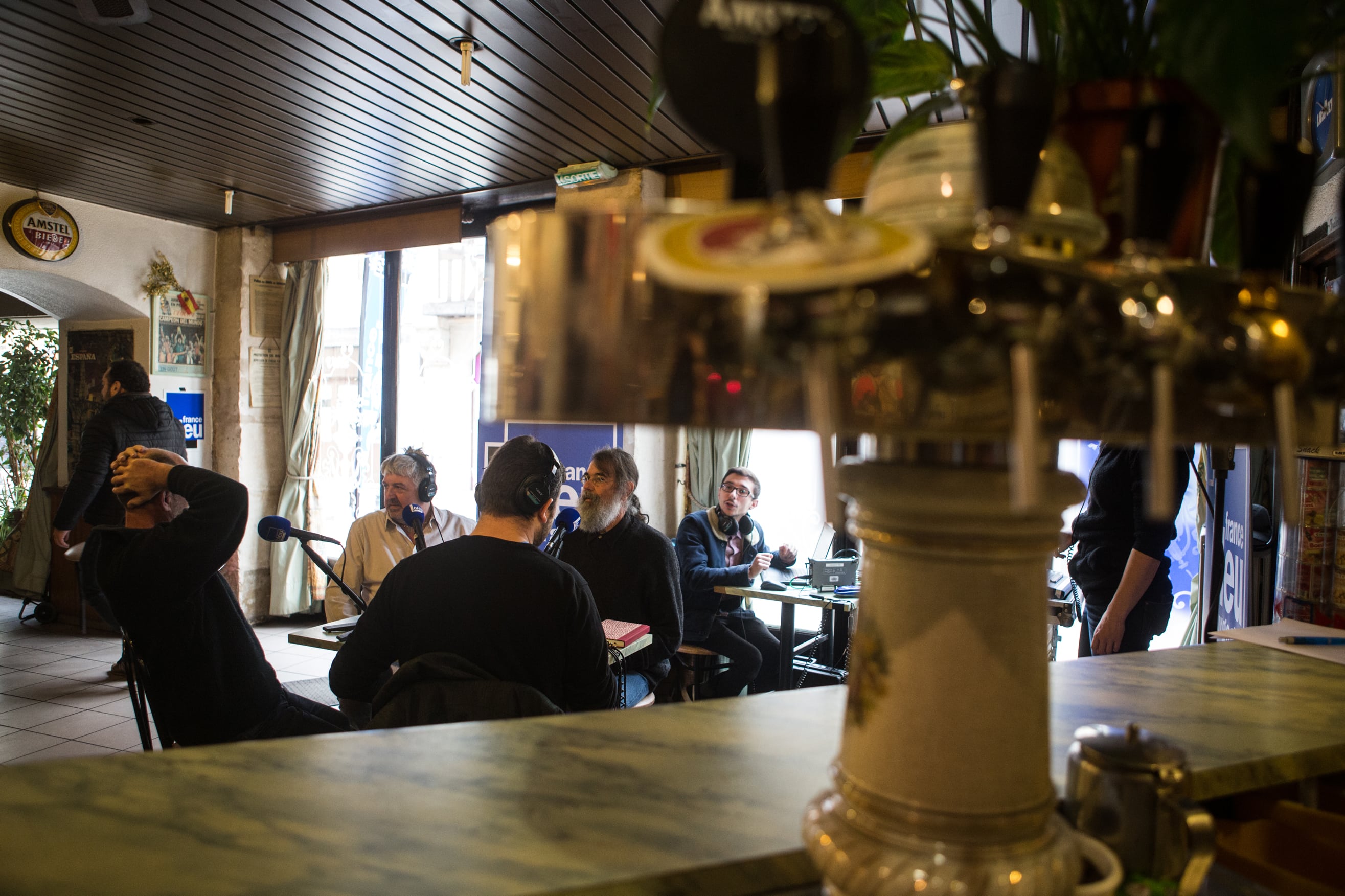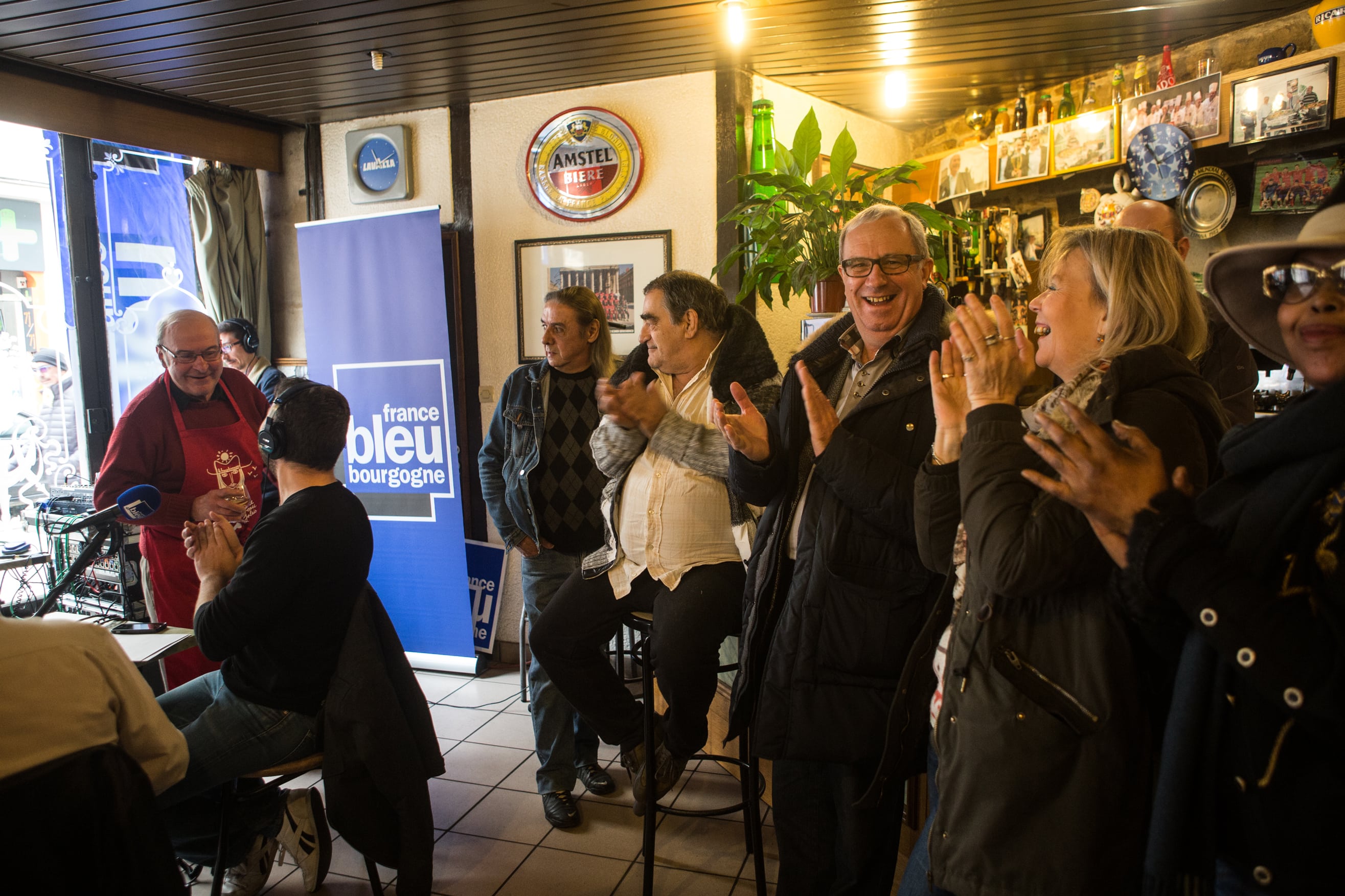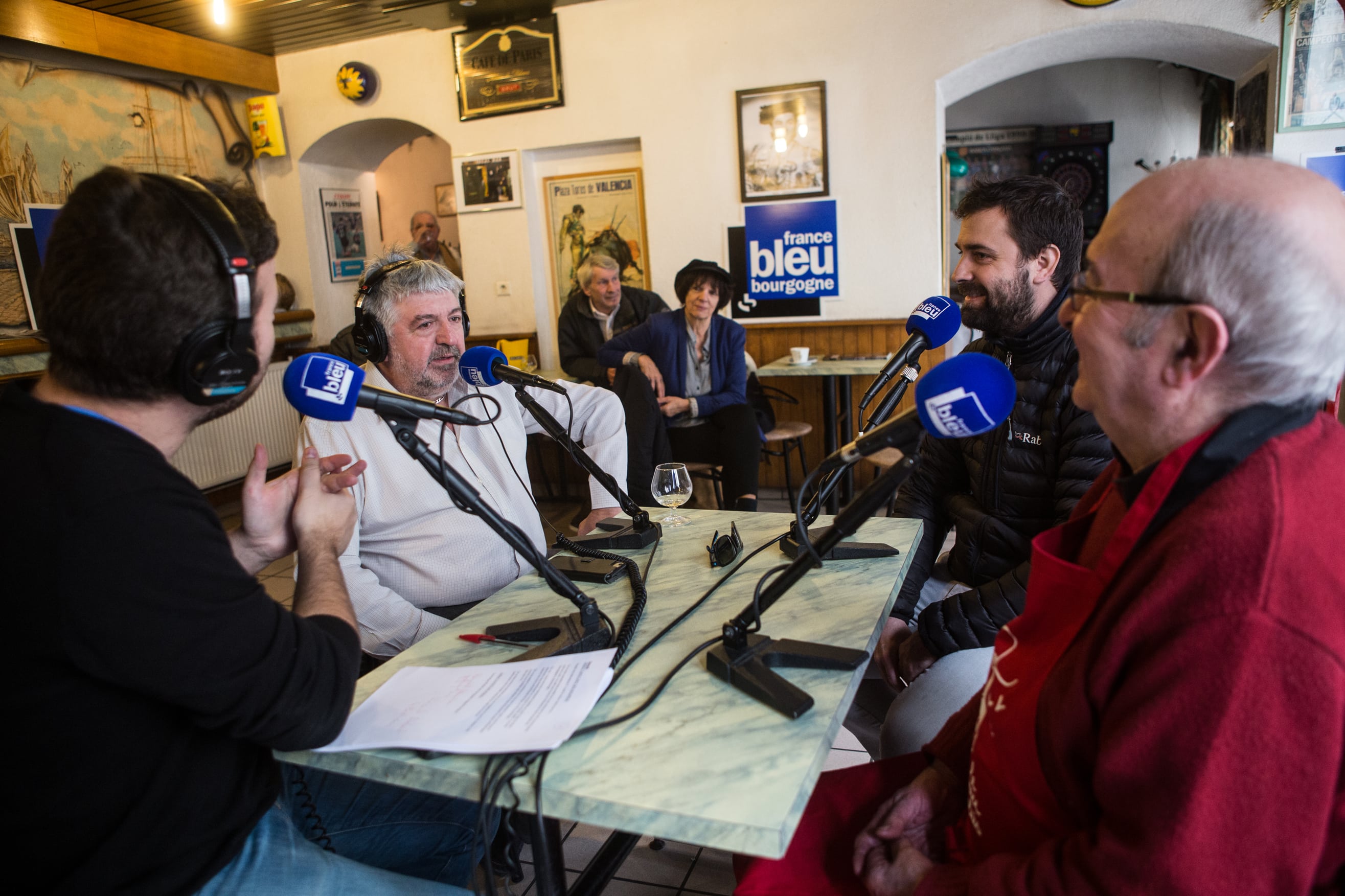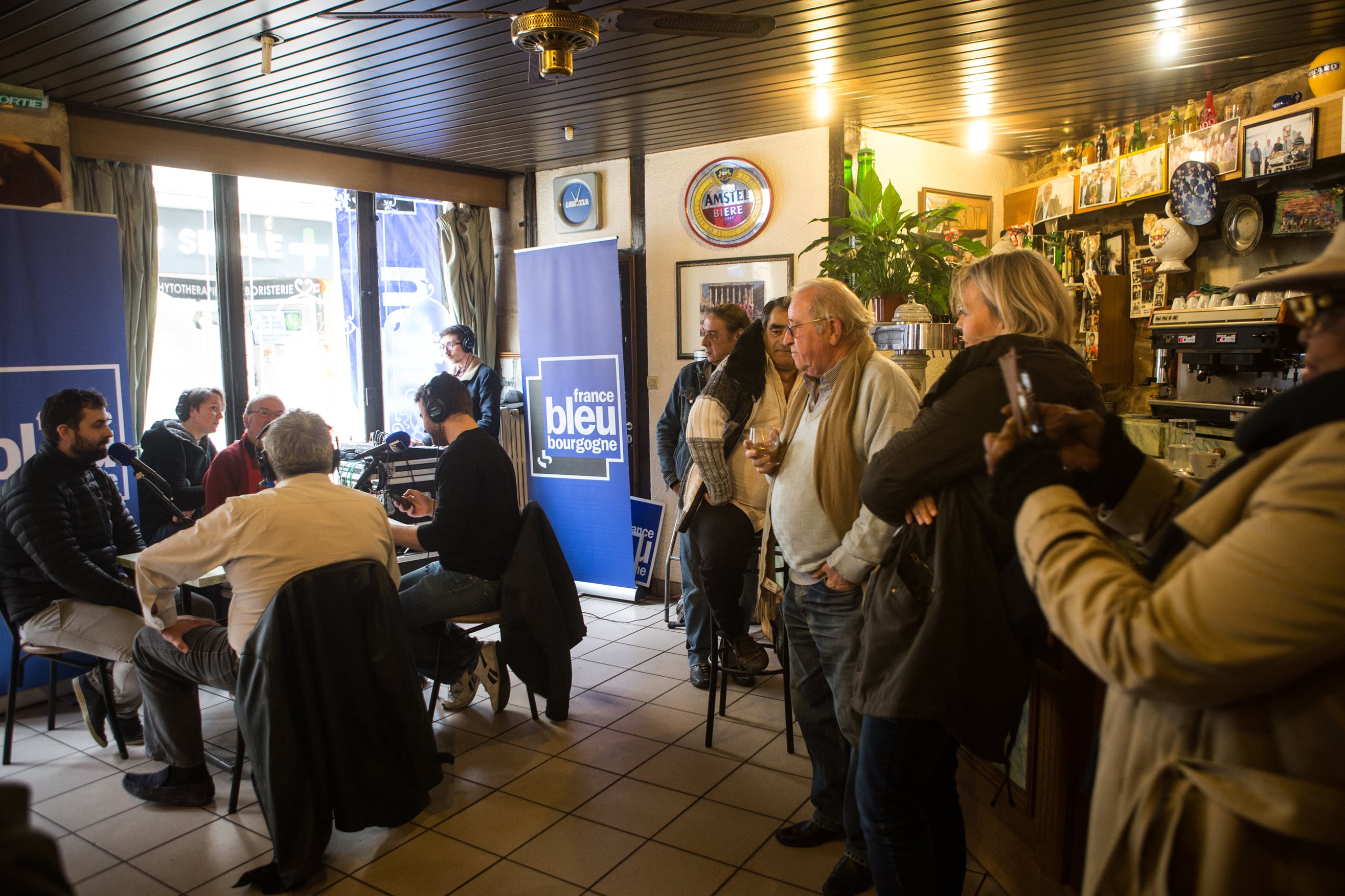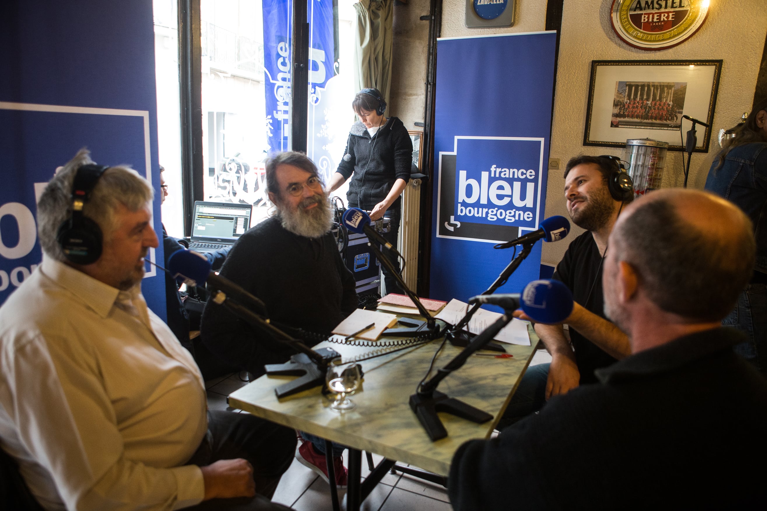 Le Café des bourrus a donc fait main basse sur l’Idéal Bar, rue Monge. En ce jeudi matin frisquet de novembre, il règne d’ailleurs une effervescence inhabituelle autour de sa belle vitrine gravée. Sur l’antique devanture en bois, flotte l’étendard de France Bleu Bourgogne, le temps de cette première matinée d’enregistrement.