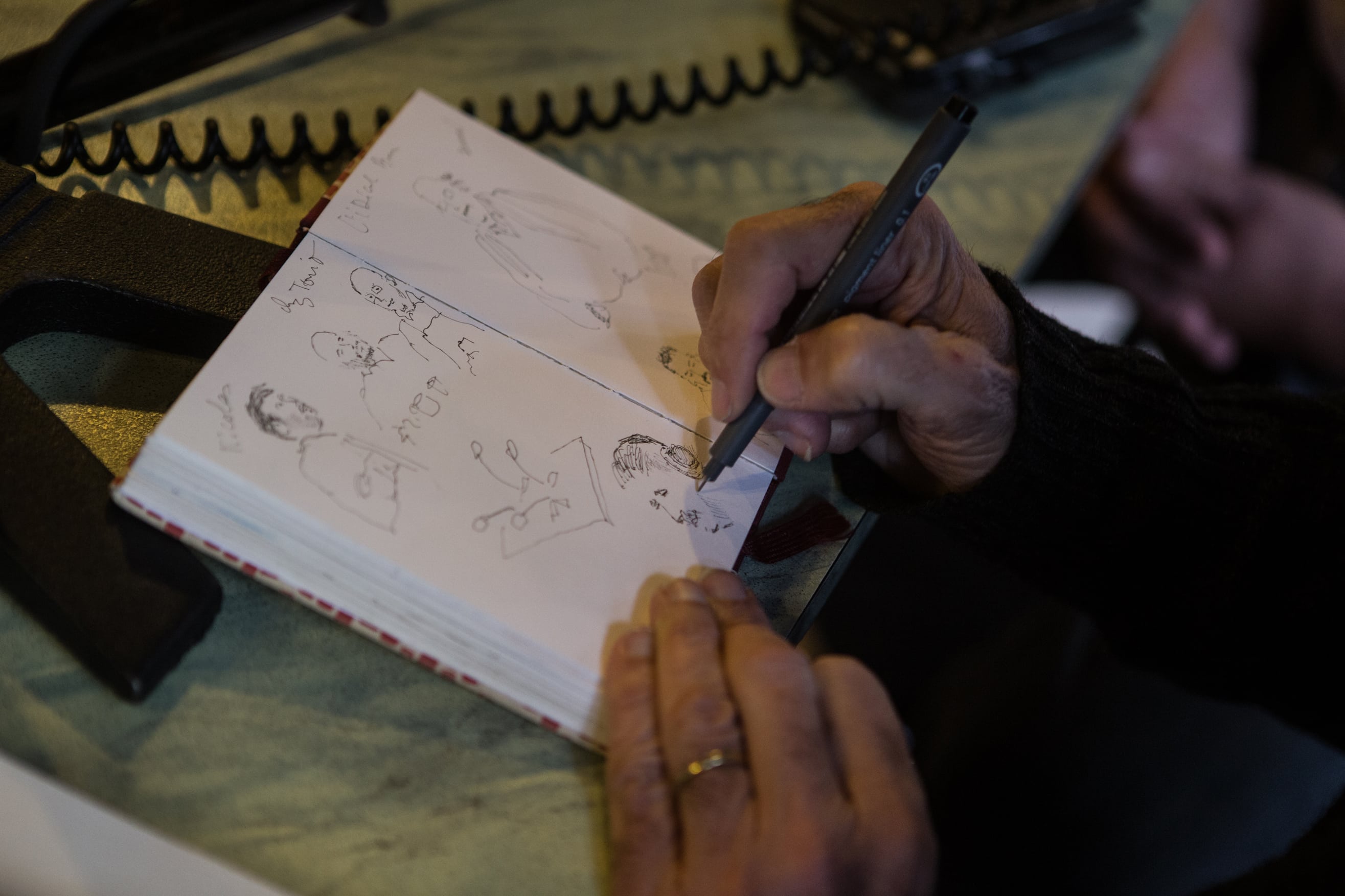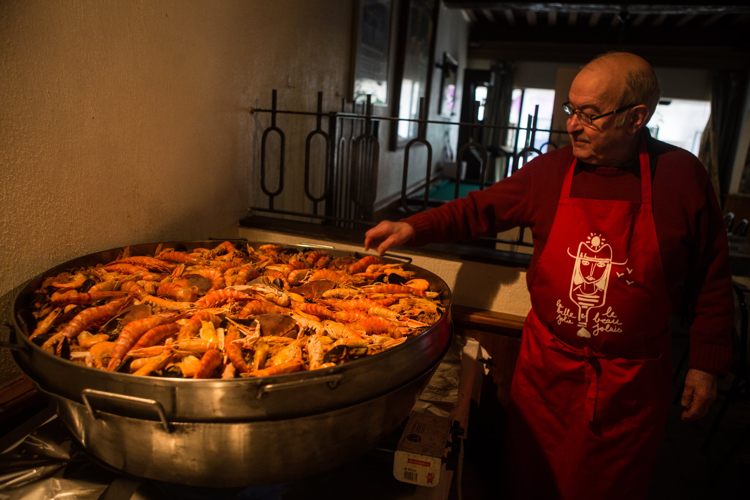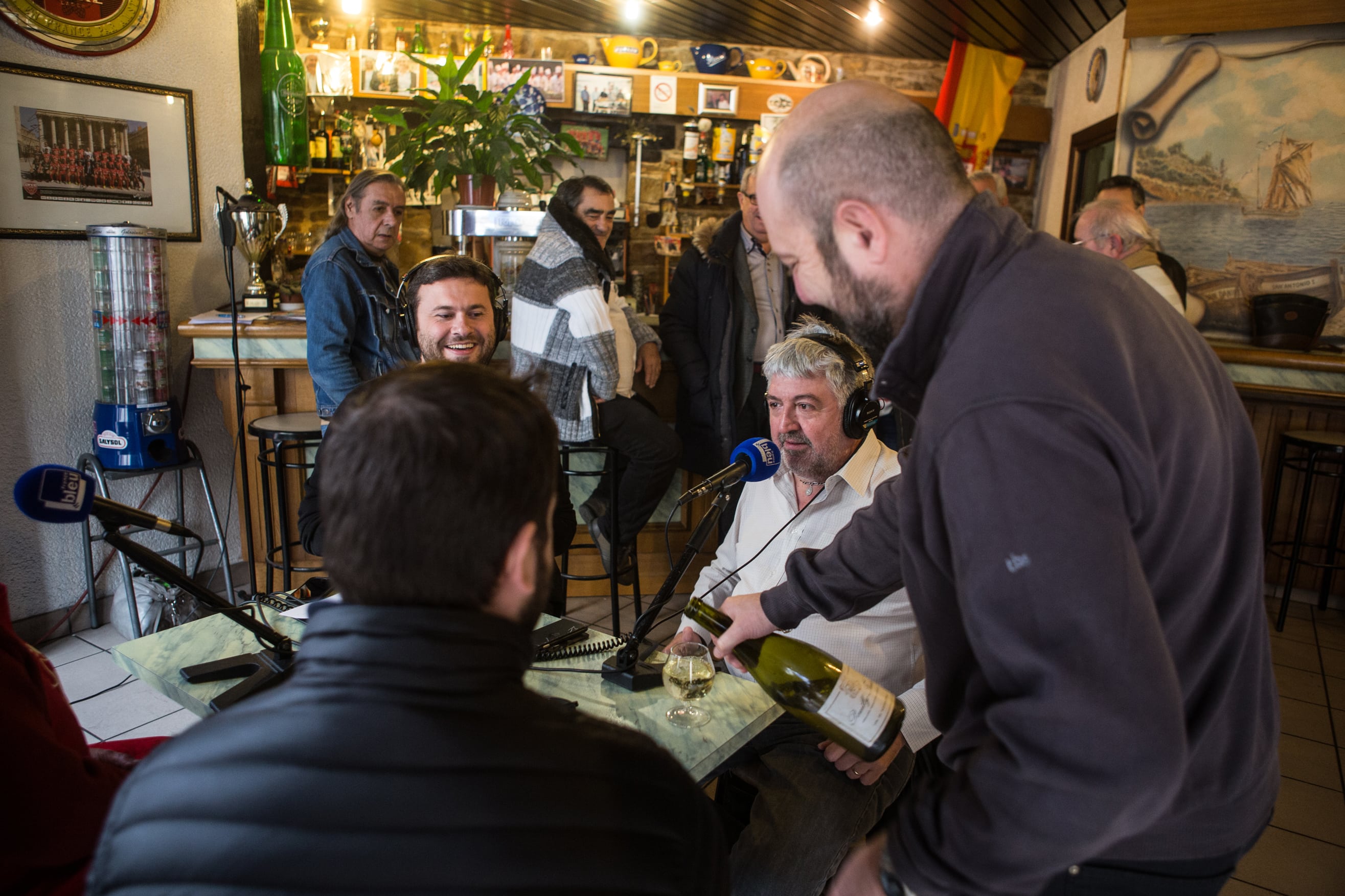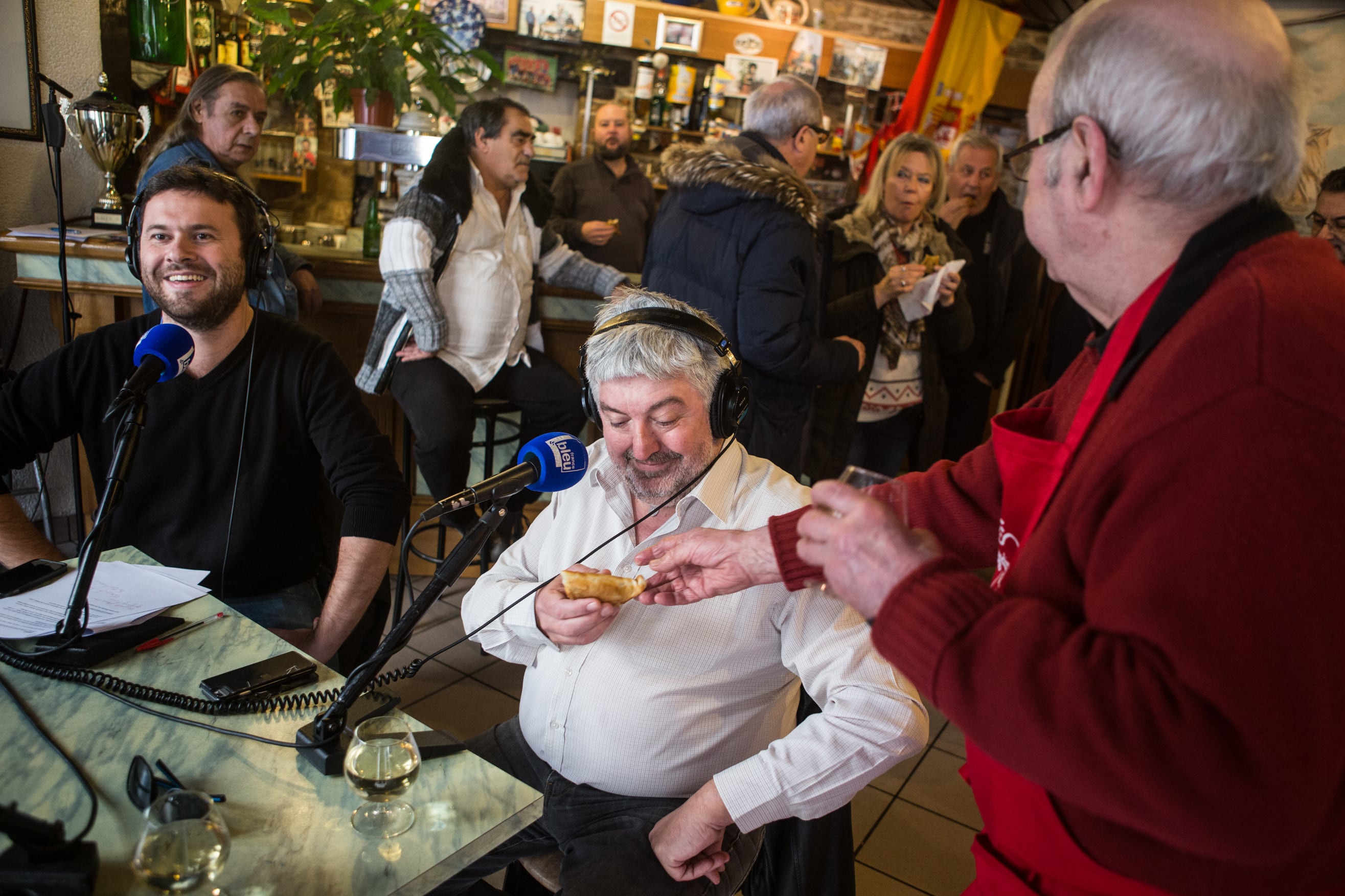 À l’intérieur du bar, les habitués un peu interloqués par le montage du studio mobile n’ont pourtant rien changé à leurs habitudes : café journal pour les uns, petit blanc limé pour les autres, le tout arrosé de quelques bonnes saillies verbales dans des effluves de safran et de moules. Derrière le comptoir, Daniel, le fils de Tonio, officie comme à l’accoutumée, alors que son paternel veille amoureusement sur la paëlla géante qui mijote au bain-marie dans l’arrière salle. Celle que tous les convives partageront à midi autour d’une grande tablée recouverte d’une nappe en papier.