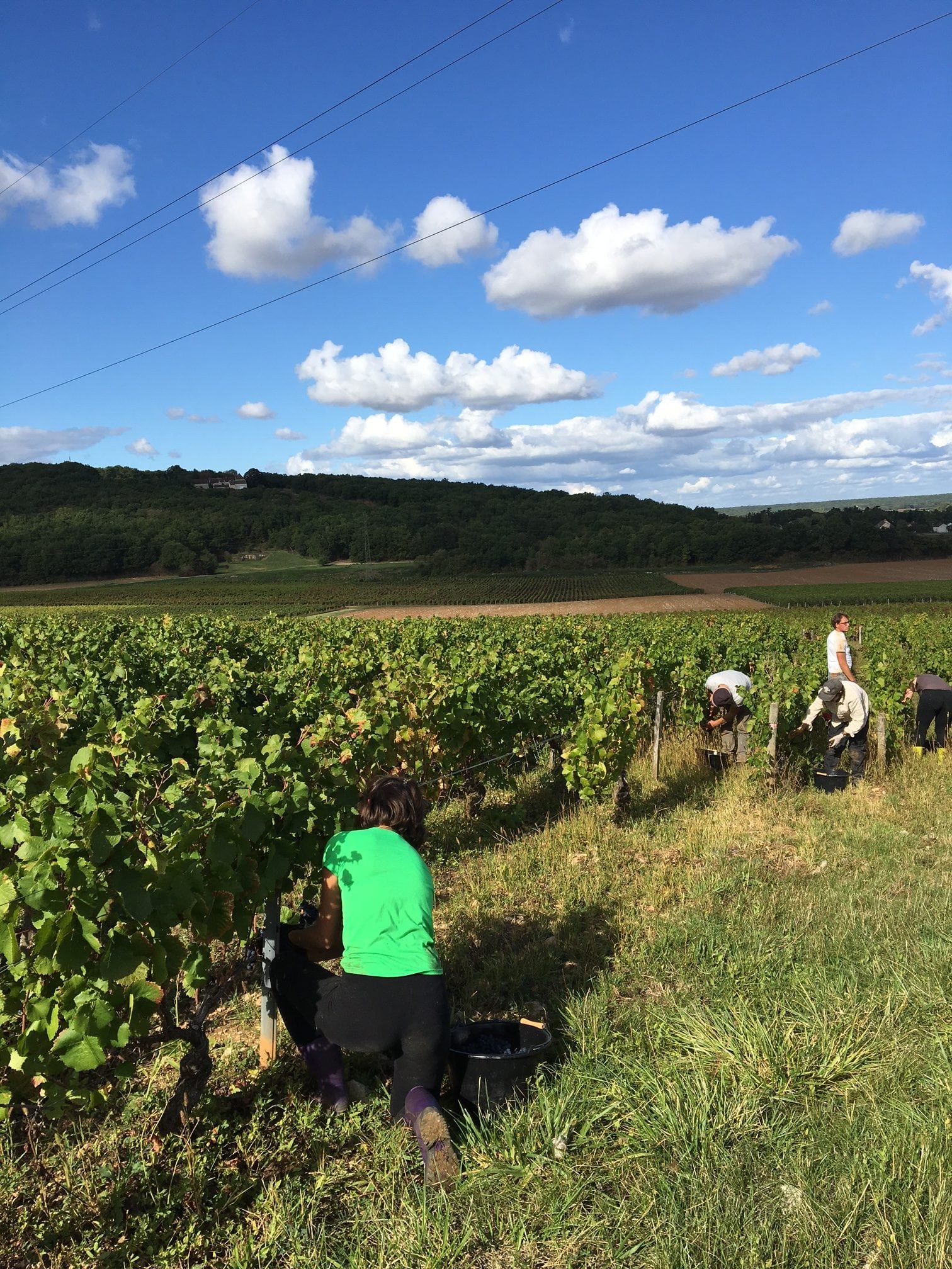 13h15, nous repartons aux vignes. Les parcelles sont de vieilles amies que l’on retrouve chaque année au même endroit. À Mercurey, la vigne des Bussières porte les souvenirs des vendangeurs présents. J’y ai perdu une semelle de chaussure et explosé un gros doigt de pied dans un tirant (cf. les risques du métier de l’épisode 1).