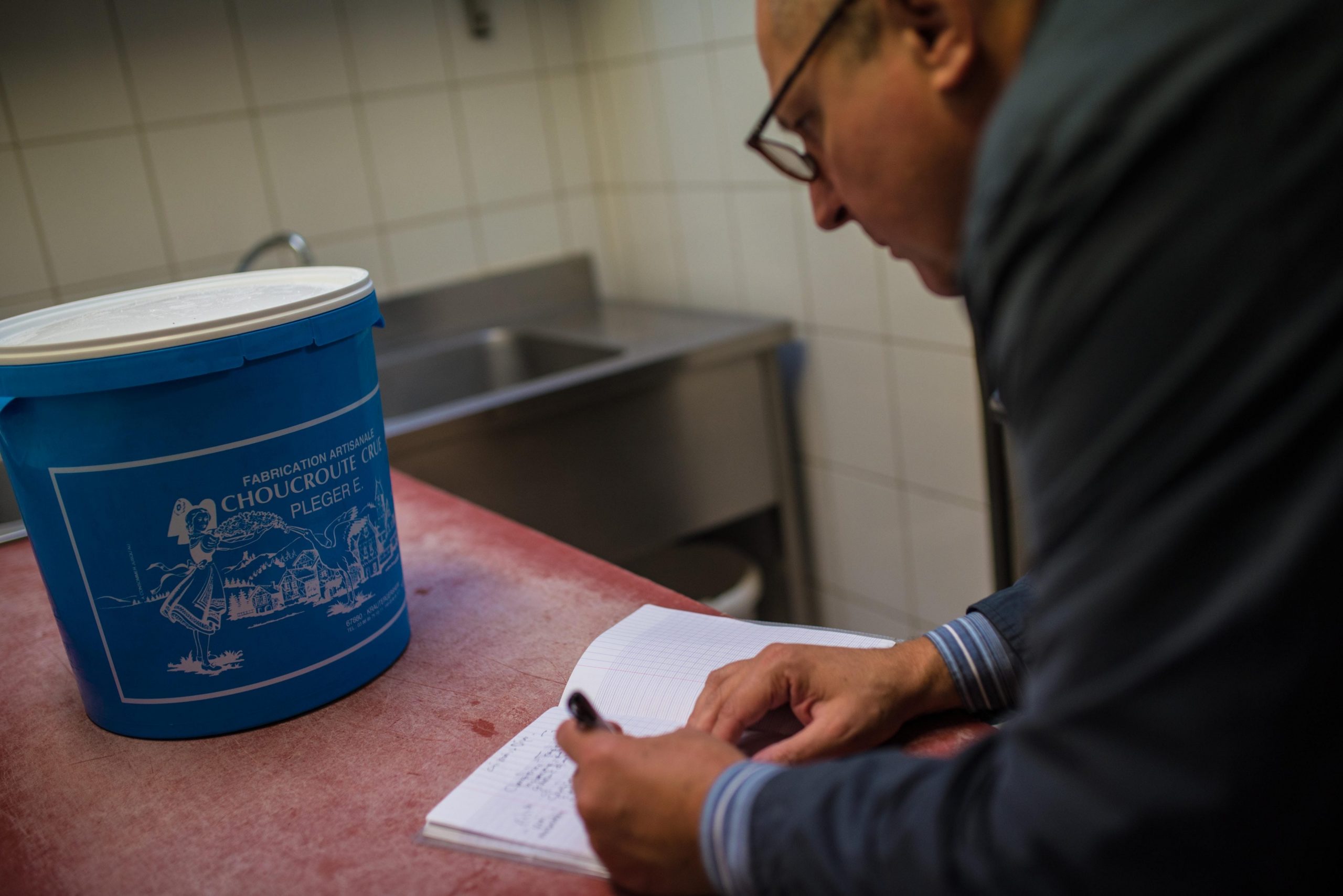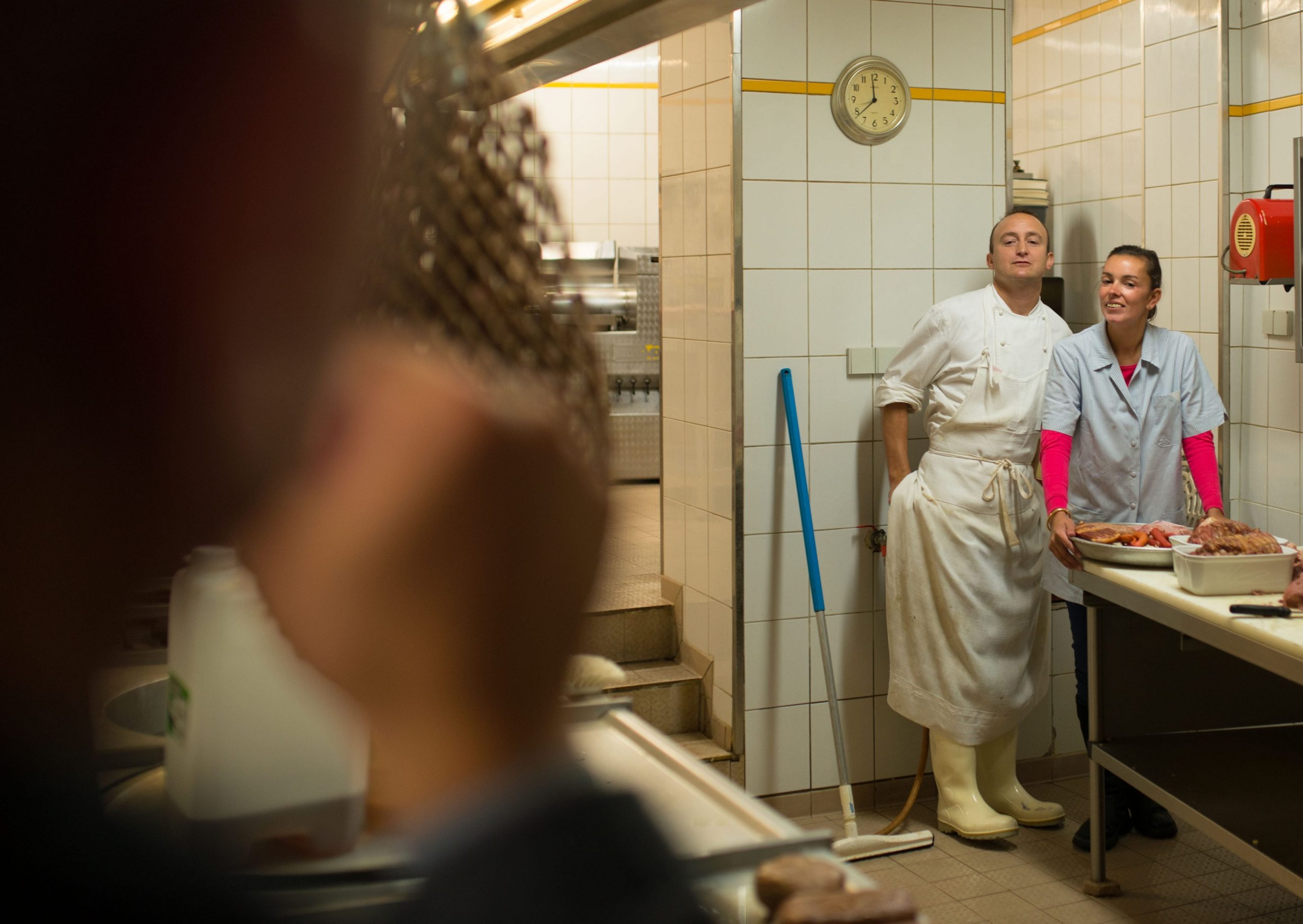 En coulisse, Christophe, le fiston de la maison moule avec application et drôlerie les jambons, au coeur d’un labo flambant de propreté ; tandis qu’Elodie la sémillante vendeuse vient chercher quelques baies de genièvre pour colorer le chou (5 tonnes à l’année, excusez du peu !)