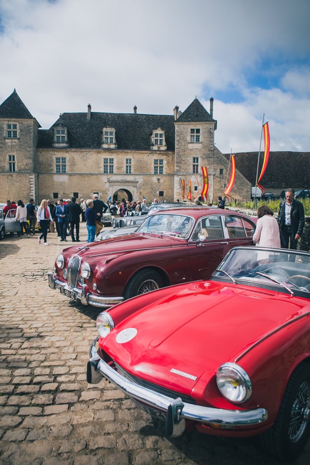 Dans l’allée solennelle qui mène au château, encadrés par les oriflammes sang et or de la confrérie des Chevaliers du Tastevin, puis par une double rangée de véhicules de collection, VIP et randonneurs du dimanche mélangés affluent vers le Saint des saints du vin de Bourgogne pour assister à un anniversaire pas comme les autres.